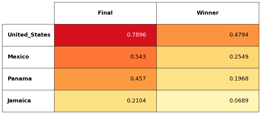 Aggregating all of the results from the Tom Model simulations, we produce a table like the one shown below that presents the odds for every team to advance to each round and to win the tournament. The most likely Final sees the U.S. play Mexico. Because the match will be played in Dallas, the Tom Model has the U.S. favored, but only slightly. Because Mexico reaches the Final so much less often than the U.S., the Americans are the strong favorites to take home the trophy.